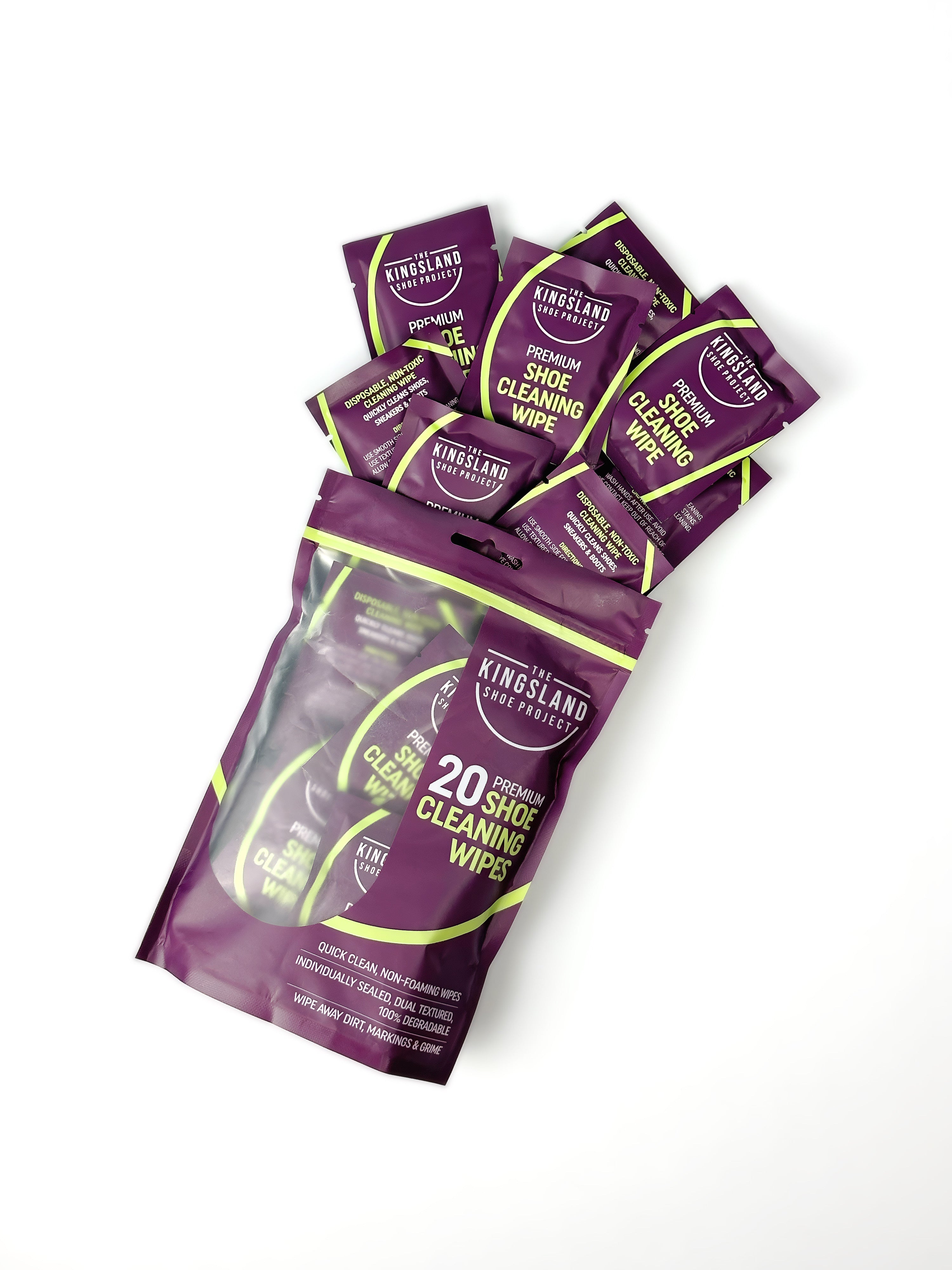 Individually wrapped, our cleaning wipes fit easily into your pocket, bag or glove compartment - perfect for on-the-go use. Whether you're heading to the office, the gym, or a night out, The Kingsland Shoe Project’s Premium Shoe Cleaning Wipes offer a convenient, travel-friendly way to keep all footwear looking it’s best.